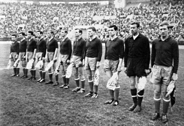 Сборная клубов СССР перед матчем. Справа налево: Нетто, Яшин, Воронин Понедельник, Иванов, Маслёнкин, Островский, Дубинский, Гусаров, Численко, Хусаинов. |